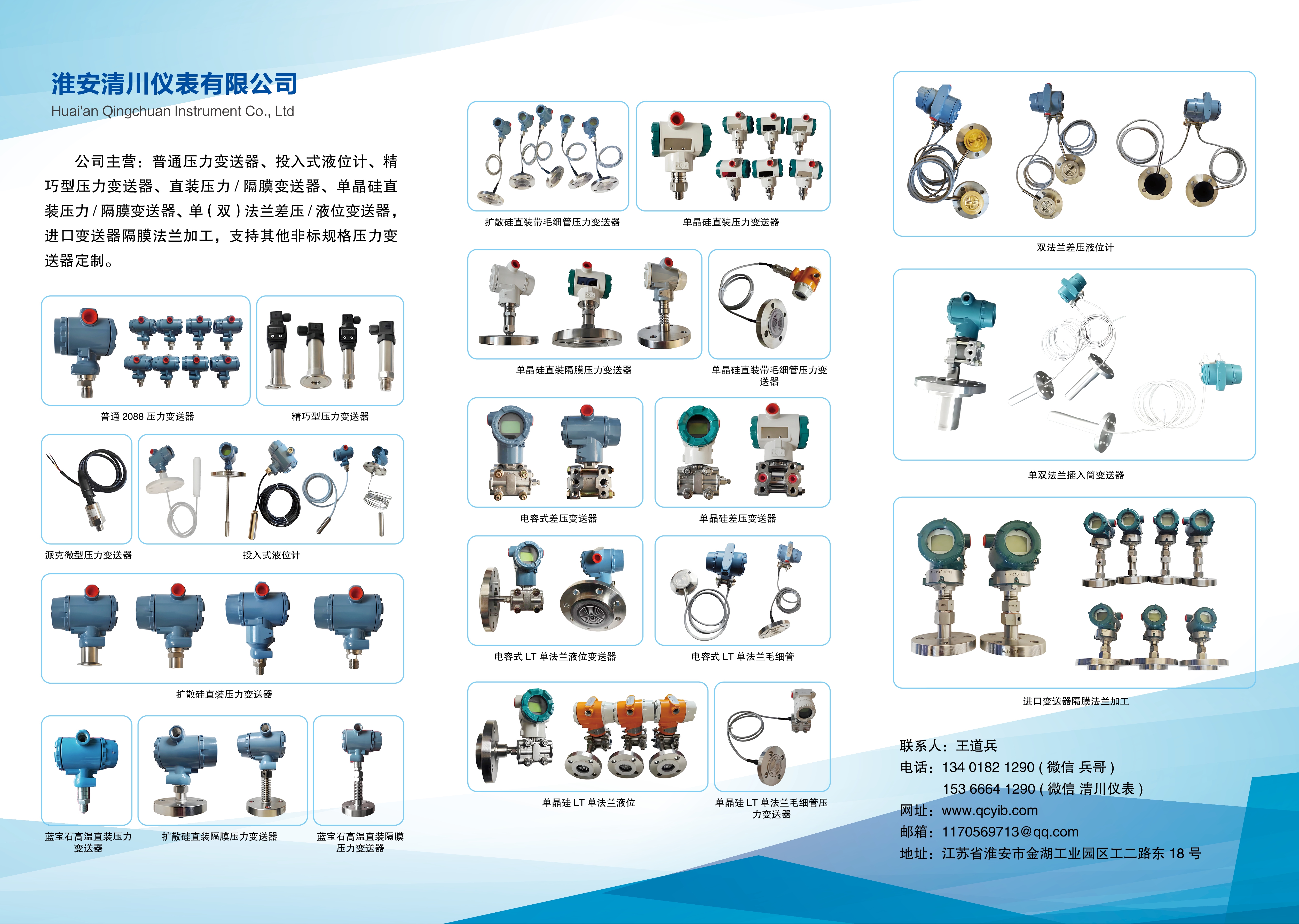 主營產品:普通型壓力變送器,電容式壓力/差壓/隔膜系列變送器,投入式液位計,單晶硅壓力/差壓/隔膜系列變送器,進口變送器隔膜法蘭加工,其它非標定制的變送器